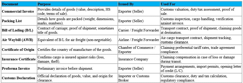 A: At minimum, a commercial invoice, packing list, and transport document (B/L or AWB).