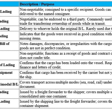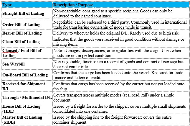 Most Used Types: Master Bill of Lading (MBL), House Bill of Lading, Seaway Bill (Also known as Express release.)